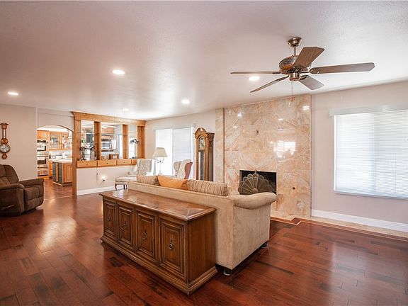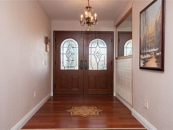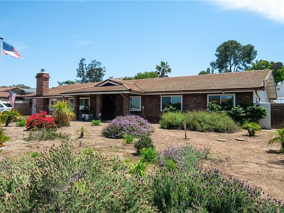 Single-story home situated in the hills of Woodcrest on a half-acre lot. Double door entry with wood-inlay flooring opens to a formal living room with fireplace and inset lighting. There is a separate formal dining room. The kitchen offers loads of cabinet storage plus a pantry and some glass front cabinets for display. Built-in electric cooktop plus a wall-mounted pot-filler faucet, double ovens and warming drawer. The family room includes a ceiling fan, overhead lighting and second fireplace. The Primary bedroom is extra-large with a French-doors that lead to the back yard, a walk-in closet and the ensuite bathroom has been updated with newer cabinets and counter, double-basins and shower. The secondary bedrooms share a hall bath. New double-pane windows throughout! The large rear yard has an outbuilding and storage shed and loads of potential!