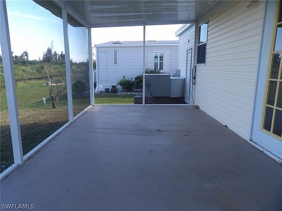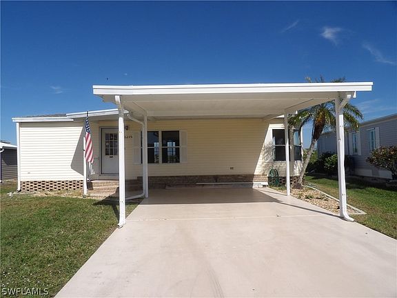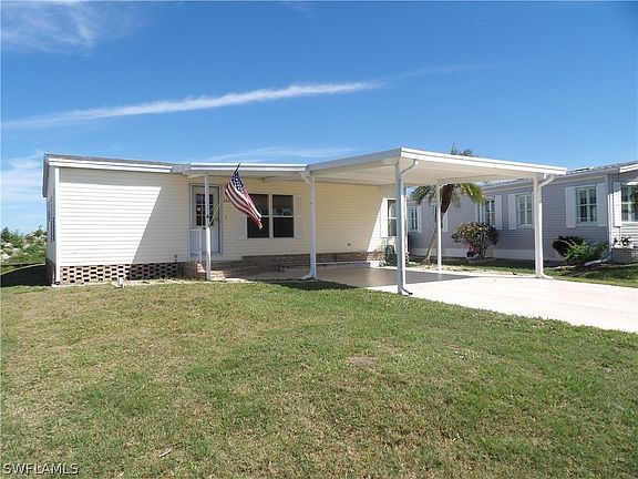 Lee Plantation is a Hidden Gem - One of the areas Best Kept Secrets. Nestled at the end of Old South Way in a Gated community with an Amazing Newly Renovated Clubhouse and heated pool, library, tennis courts, pickleball, bocce ball, exercise room, lots of planned activities such as bingo, card games, cookouts, pot luck dinners, dancing, LOW HOA fees and SOOOO much more! This 55+ community is Pet friendly and allows for up to 4 rentals per yr w/minimum of 90 day stays. People love this park and many are 2nd & 3rd generation. This home has great potential and with some TLC could fulfill your dream of living in sunny SW Florida or even as a great Investment opportunity in a park that YOU OWN THE LAND! This home has a greatroom floorplan, large open kitchen, dining and living areas and 2 bedrooms. The Lanai and Flat roof are Brand New (2024). An additional concrete pad behind home would be great for a shed or grilling area. Attached carport can house approx 2 vehicles with additional driveway space for more. Golf carts more than welcome. Generous greenspace to both side and back of property. Call today!!