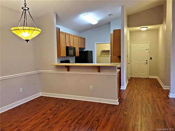 Ideally located in the heart of Ballantyne, this home features all the best that Copper Ridge has to offer. The home is an end-unit located on the second level and features soaring vaulted ceilings. The attached one car garage is easily accessible from the interior. The building has a secured front door and an intercom in the home. The bright and open floor plan has neutral decor throughout, kitchen with ample cabinet and counter space and smooth top range. The laundry room has additional storage. The master suite has a large walk-in closet and the master bath features a double vanity, walk-in shower and garden tub. Enjoy the wood burning fireplace in the family room! Roof replaced in 2017. Copper Ridge is conveniently located near shopping, dining, entertainment and I-485. The community features include swimming pools, fitness center and tennis. Welcome Home! There is a 15% rental cap that is at capacity with a waiting list.