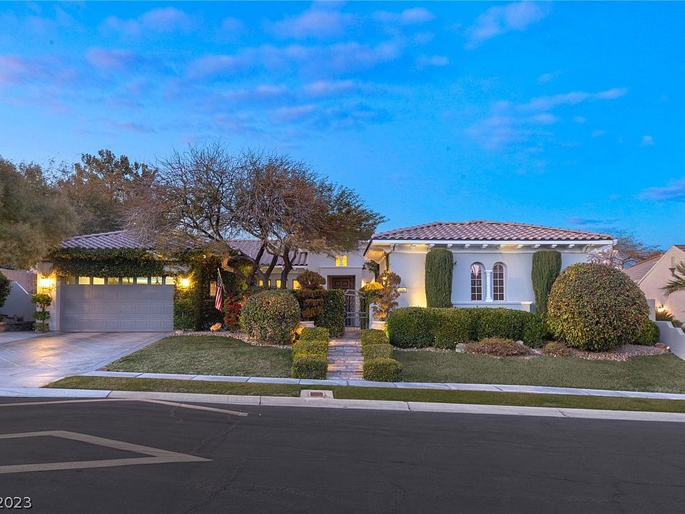 Welcome to a guard gated enclave of The Vineyards. Mature & lush landscaping greet you as you arrive to a rare opportunity; a fully reimagined single story within Summerlin. Built by renowned Christopher Homes, the home feat. 4 beds & 4 baths including a casita & private backyard w/ pool & spa. No expense was sparred in reimagining this semi-custom home & creating a light & open floor plan. The courtyard feels as if you are stepping into a Montecito villa w/ the smooth stucco exterior, greenery & tranquility of the fountain. Inside, the floor plan offers the perfect backdrop for any occasion thanks to a dining room looking out to the courtyard, a lounge for entertaining & the great room w/ several spaces to enjoy. From the custom bar w/ refrigeration drawers, conversation area, linear fireplace & the brand new kitchen feat. stunning quartzite counters, oversized island, GE professional grade appliances & illuminated cabinetry. A spa like primary bed and so much more awaits you!
