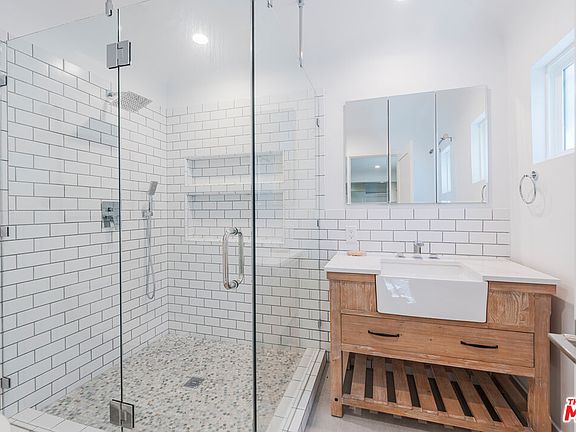 Farmhouse vanityNew vinyl privacy screensSpa-like bathroomStunning kitchenCustom touchesDeluxe subway tile backsplashQuartz countertops