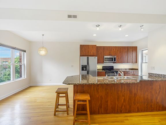 HIGHLY UPGRADED TOP FLOOR 2 BR/2 BATH CONDO WITH LARGE OPEN FLOOR PLAN! BRIGHT NATURAL LIGHT THRU TONS OF THERMAL PANE WINDOWS. FANTASTIC KITCHEN W/ THICK L-SHAPED GRANITE ISLAND, STAINLESS STEEL APPLIANCES, 42" CABINETS & PANTRY! HARDWOOD & GRANITE FLOORS. LUX MASTER SUITE W/ PRIVATE BATH W/ WHIRLPOOL TUB, GRANITE & MARBLE TILE & STONE FIREPLACE! 2ND BATH COMPLETELY REMODELED! CENTRAL HEAT/AC + CEILING FAN. NEWER FRONT LOADER WASHER/DRYER! LARGE REAR DECK CAN BE ACCESSED FROM MASTER BR OR BACK DOOR, PERFECT FOR GRILLING & LOUNGING! 1 ASSIGNED PARKING SPACE IN REAR PLUS EXTRA STORAGE LOCKER INCLUDED! EASY ACCESS TO EVANSTON BEACH, CTA TRAIN & BIKE PATH. AVAILABLE IMMEDIATELY. NO PETS & NO PETS & NON-SMOKING BUILDING.