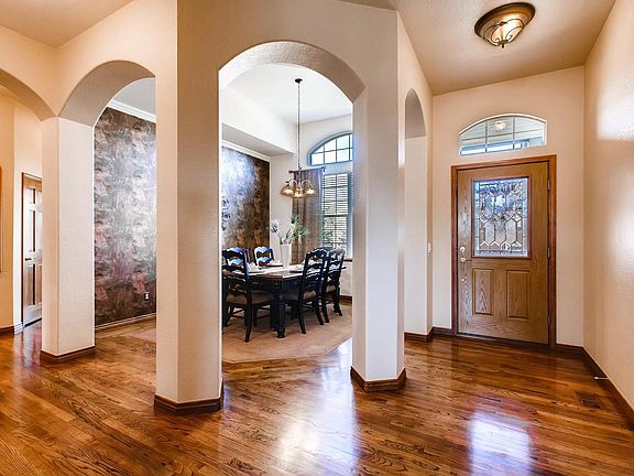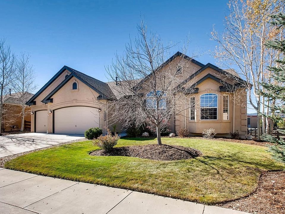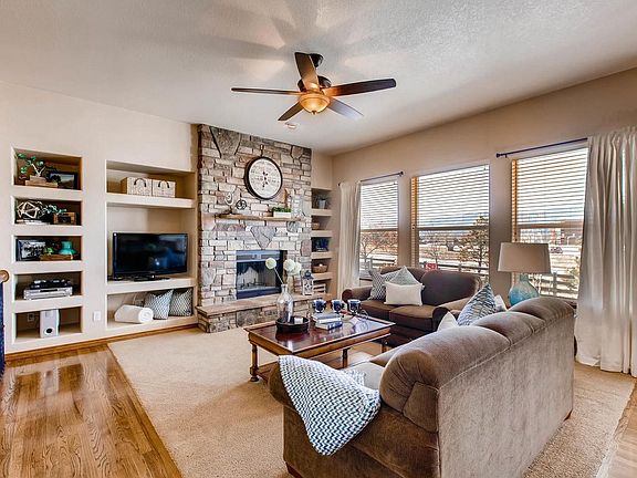 Watch your children walk to school! This D38 open floor plan Classic built home is gorgeous! Enjoy views of Pikes Peak from the family room and watch the kids walk to school while enjoying your morning coffee! This ranch plan has it all! 42" hickory cabinets, double ovens, extra quiet dishwasher, island and separate breakfast bar in the kitchen. Cozy rock fireplace with built ins in family room! Master bedroom has room for sitting area and extra large closet! Spa like master bath! Office/second bedroom on the main. Entertainment will be easy in the basement with custom wet bar, full size included fridge and another cozy fireplace. Junior master in the basement makes having guests a joy. Two other large bedrooms share a large full bath with two sinks and a huge walk in bath closet! Basement also has two built in desks for week day studying! This great Jackson Creek lot has privacy and allows the kids to walk to one of the amazing D38 schools!