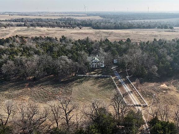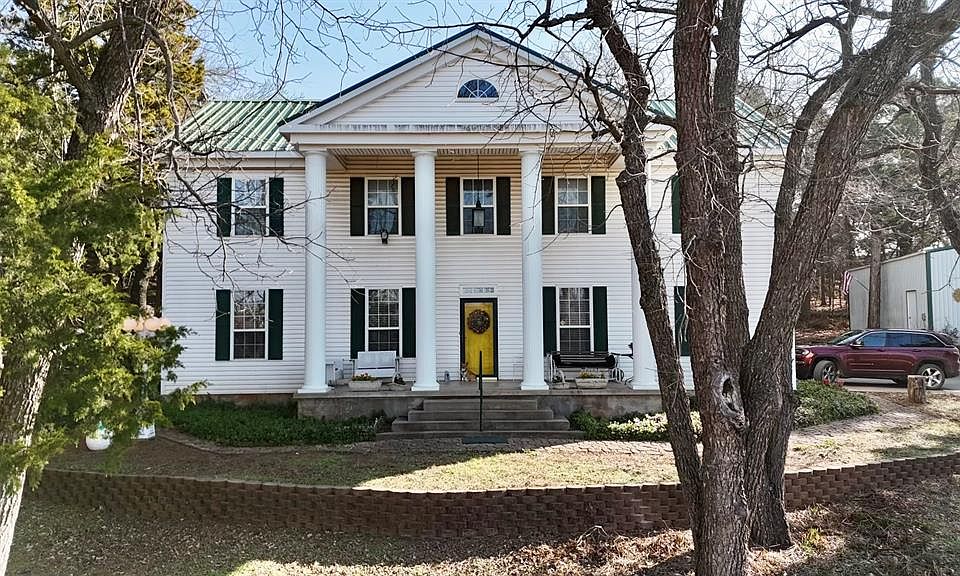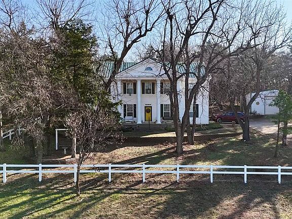 Looking for your place of tranquility in Oklahoma? This antebellum estate is nestled on an expansive 80-acre paradise. With nice pastures and plenty of canyon for wildlife. You have your own stocked fishing pond!, The beautiful three-bedroom, three-bath colonial home offers timeless charm surrounded by nature’s serenity. Thoughtfully designed with classic architectural details, the home features spacious living areas filled with natural light, creating a warm and inviting atmosphere. 9 foot ceilings and quartz counter tops throughout. Home has a modern geothermal system and 6 inch exterior walls. Built for comforter and affordability. From peaceful mornings overlooking the landscape to cozy evenings indoors, every space is crafted for comfort and connection to the outdoors. The outdoor front porch and back deck are great escapes. There is an above ground storm shelter, 24x30 shop and beautiful vinyl fencing.