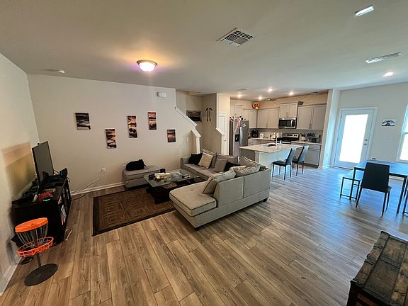 $1,000 MOVE-IN SPECIAL!! Luxurious, pet-friendly, 1-car garage home with open concept design ready for you to call home. Enter through the spacious living area with tall ceilings and hardwood floors throughout with access to your attached garage right off the entrance. Continue through the open-concept design to your kitchen and dining space. The kitchen boasts SS Appliances, tall cabinets with granite countertops, pantry for storage, and large island with sink and counter overhang to eat and entertain. The dining room overlooks the backyard and walks out onto your private patio with privacy dividers with NO NEIGHBORS behind you. Half bath also on the first floor.