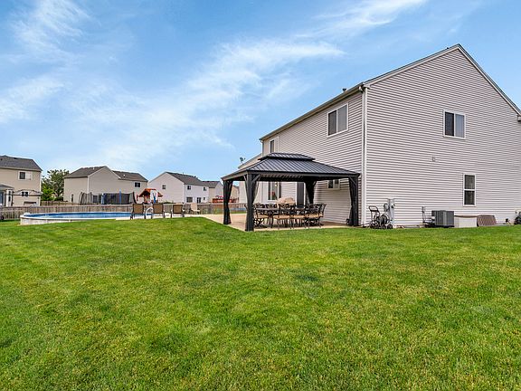 Large cul-de-sac premium lot surrounded by new 369' cedar fence, 28' round 4 feet deep above ground pool and a 15X11 gazebo. Spacious 4 bedrooms plus loft and 2.5 baths. All natural hardwood floors in 1st floor and new carpeting in 2nd floor. Beautiful kitchen with white cabinets over looking family room. Central air conditioner 2 yrs, roof 6 yrs, unfinished basement with bathroom rough-in. Extra deep garage with 2' front extension. Great entertaining Home!