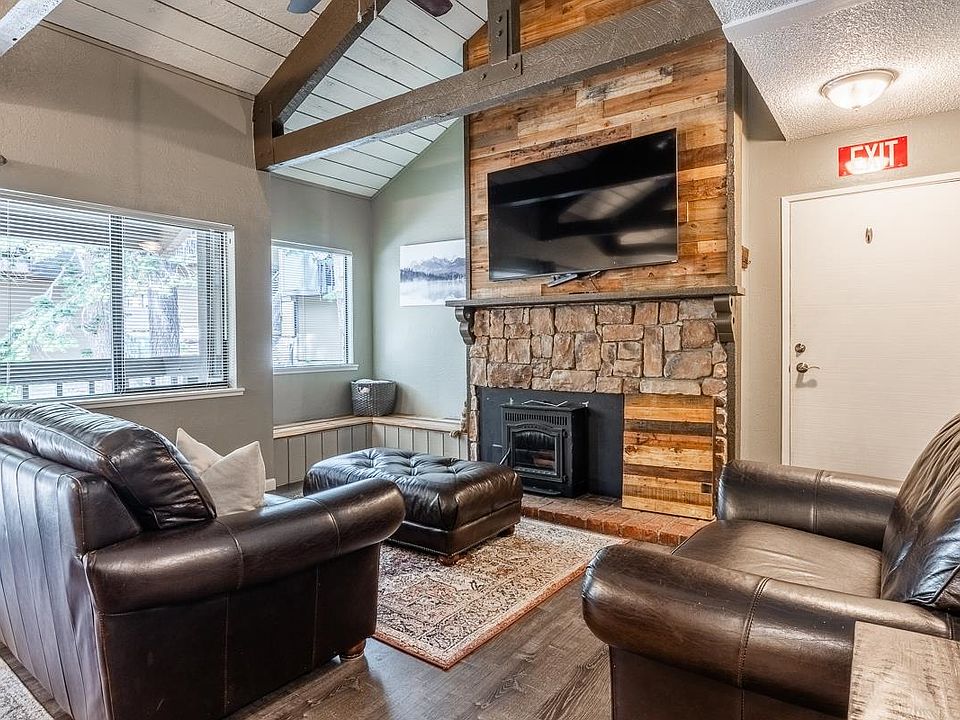This updated one bedroom plus loft condo is located in the popular Bigwood complex. Bigwood is located between The Village and Eagle Lodge and near Sierra Star Golf Course. The location offers easy access to the town bike path and is less than 3 miles to the Lakes Basin. The main level has an open living area with vaulted ceilings and newer pellet stove to keep you cozy in the winter. Also on the main level is bright white kitchen, dining area, bedroom with King bed and full bath. A small deck is just off the dining room. Upstairs is the private loft area with a large window allowing for plenty of natural light, one full bed, one queen bed and full bath. There are also two large closets upstairs -- option to add washer/dryer in one of the closets or use as an owner closet. Relax in this quiet and peaceful setting as there is no one above you or below you and only one shared common wall. This condo is being sold furnished and ready for you to enjoy. The Bigwood complex features a pool, jacuzzi, sauna and common area laundry.