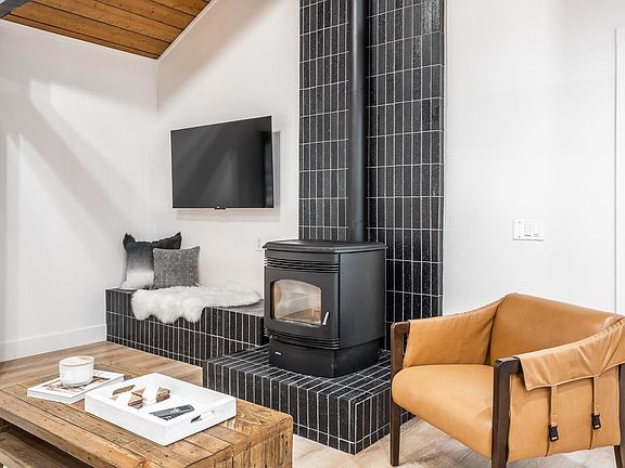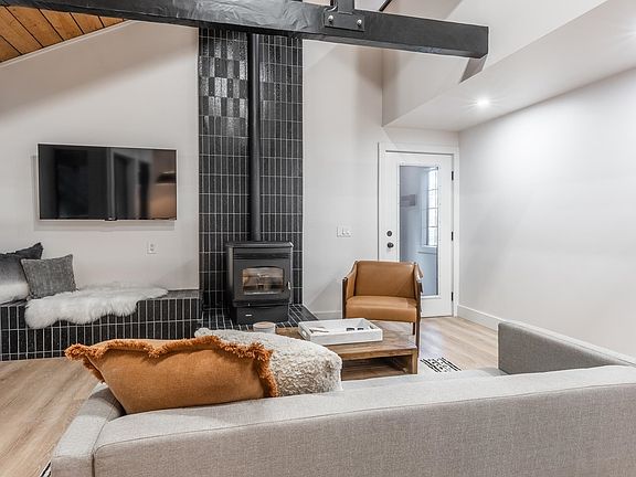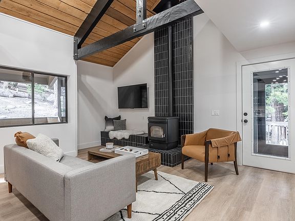 Welcome to your stunningly updated mountain home! This spacious, end condo is a 1+Loft with 2 full bathrooms boasting exposed truss beam vaulted ceilings that add a rustic element to the all-new modern interior. Designed by a professional interior designer, no expense was spared with the brand-new open kitchen with sleek quartz counter tops, all new appliances, and thoughtful details which opens to the living space and a cozy breakfast nook with built in benches. Soak up the tree and hillside views out to the private deck while cozying up to the brand new pellet stove set on a stylish black tiled plinth and built in tiled wall bench. Enter into an enclosed mud room with stone tile flooring and space for coats and gear. The bedroom and loft are bright with lots of windows, and you can keep toasty warm with the new “remote thermostat controlled” hydronic baseboard heating. The loft is spacious enough to fit two twin beds or a queen bed with plenty of space to spare. The impeccably detailed bathrooms stunning details including Zellige, designer lights along with additional modern details. In addition to the curated furnishings, interior solid wood doors, and lighting, there is also a brand-new water heater. The ultimate convenience is the stackable washer and dryer in the upstairs bath and built in storage attractively hidden behind a modern barn door. This is one of the only condos in the complex with an extra-large front deck to soak up the sun and breath in the crisp mountain air. This luxury escape is tucked away in a private, quiet corner in the complex with lots of privacy and a one car garage to keep your car out of the snow. Bigwood Condos is nicely located down a quiet street near the Sierra Star Golf course and adjacent to the Town of Mammoth Lakes bike path. The convenient location is less than a mile to Little Eagle Lodge where you can play on the slopes all day and then retire to your mountain retreat.