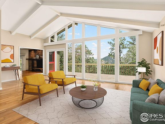 Perched to capture some of the most breathtaking views in Boulder, this remarkable property is exceptionally priced in Pine Brook Hills, offering a rare opportunity to create your personal sanctuary. The main home invites with a dramatic living room showcasing soaring, beamed ceilings and expansive floor-to-ceiling windows framing the endless panorama. The kitchen features a breakfast bar, dual ovens, a pantry, and opens to a wraparound deck-perfect for savoring the vistas. A fireplace-warm dining room adds charm and warmth. Upstairs, discover three bedrooms, including the primary with a private 3/4 ensuite bath. The walk-out daylight lower level boasts a spacious rec room with a gas fireplace, and built-ins. Transform the large non-conforming bedroom with walk-in cedar closet into a luxurious owner's suite, or envision as private guest quarters. Additional highlights include a valuable irrigation well and a handy garage/workspace. While the home invites updating, the setting, views, and possibilities are simply extraordinary.