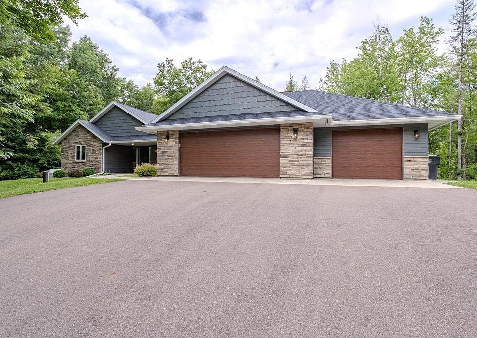 Located on a private cul du sac this picturesque home rests surrounded by mature trees on a 2.72 acre lot. This home was designed to incorporate modern luxury with some rustic charm, and has top quality materials and craftmanship. You will enter the zero-entry front door in to the open concept living room with cathedral ceiling, gas fireplace, dining area with patio doors to the deck. A gourmet kitchen includes high-end SS appliances, walk-in pantry, large island, quartz countertops, and room for 5 bar stools by the breakfast bar. The primary bedroom is on east wing complete with walk in closet and primary bathroom with dual sinks, and two- person tiled shower. Two additional bedrooms and a full bath are located in the west wing of the main level. As you enter the home from the insulated garage there is a large closet and built in bench with storage leading to the main floor laundry room with built in folding counter.,The lower level offers 2 generous size bedrooms, a full bathroom, living room area, beautiful wet-bar with bar frig, entertainment area, and electric fireplace. You will love entertaining and enjoying the park like setting on the stamped concrete patio with wrought iron fence in the back yard. There is a walking trail to the ATV/Snowmobile trail that runs adjacent to the property, and there is deeded access to the Eau Claire River just down the road. Great neighborhood close to shopping, Riverside Elementary school, and medical facilities.