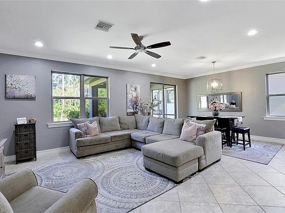 Immaculate 4 b/r nearly new (built 2016) home with the most-desired open concept design featuring a modern island kitchen with plenty of cabinet and counter space. Great for entertaining and for staying involved with family activities while overlooking the great room and open dining area. For convenience, the pantry, laundry room, and entry from the garage are just steps away. The owner's suite is located on the ground floor (3 bedrooms are upstairs with a large living room and a full bath) featuring a walk-in shower with waterfall shower head and floor to ceiling tile. This community is in demand by those who value highly rated schools in Collier County plus proximity Naples beaches, dining, shopping, and recreational opportunities such as the Collier County Water Park - all are nearby. This is a gated, pet-friendly community with low HOA fees, no CDD, and this is a wonderful home with custom paint, crown moulding, specialty lighting, and many more upgrades. Note that the driveway, one of the longest in the community, provides additional parking space, as needed.