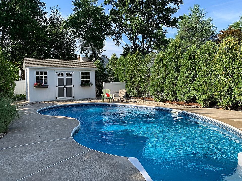 Vacation from home in your own downtown oasis! Move right in to easy one-floor living, two blocks from West Hartford Center, complete with a beautifully landscaped yard and in-ground pool. This updated home provides easy access to all West Hartford has to offer while providing your own backyard resort to relax and recharge. Swim and lounge by the gorgeous in-ground pool, surrounded by trees and a new fence. Store your outdoor gear in the large shed and enjoy your morning coffee on one of the large outdoor patios. The open-concept floor plan is perfect for entertaining and features vaulted ceilings, lots of natural light, and a new gas fireplace. White kitchen cabinetry and classic white backsplash complement the gray island, complete with a breakfast bar. The oversized main bedroom provides plenty of room for a king sized bed and furniture and overlooks the gorgeous, private yard. The second bedroom could easily be used as an office and has a large closet for storage. The bathroom is huge, with a newly tiled shower/tub. This unique property is ready for you to move in and enjoy!