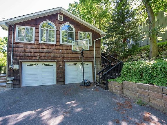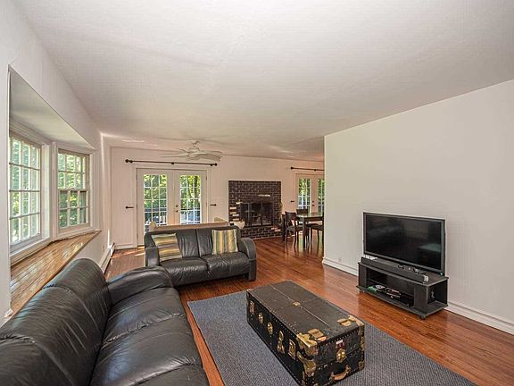 Awesome raised 4 BR 2 BTH ranch is situated on a lush wooded .25 Acre. An updated great interior flow adds to the leisure living and functionality. Huge Bi-level decks overlook a secluded private yard with beautiful stone retaining walls. Large open floor plan has wood floors throughout. The open concept Living Room/Family Room w/brick wood burning fireplace is situated between 2 sets of French Doors that lead out to the decks. Vaulted ceilings add to the airy open concept layout w/large palladium windows and skylights that allow for lots of natures sunlight. Freshly painted interior, beautiful custom maple kitchen cabinets w/built in wine rack, serving unit & island, all stainless appliances. Large full basement w/storage, entry to 2.5 garages & laundry (new: Electrolux washer and dryer) Finished Family Room/guest quarters w/full bath and OSE. Private BEACH! True vacation style home near golf, beaches, shopping, theater & fine dining. HUGE PRICE ADJUSTMENT !!