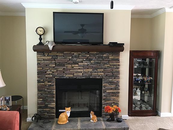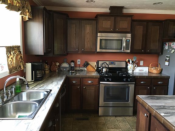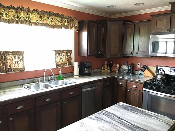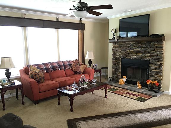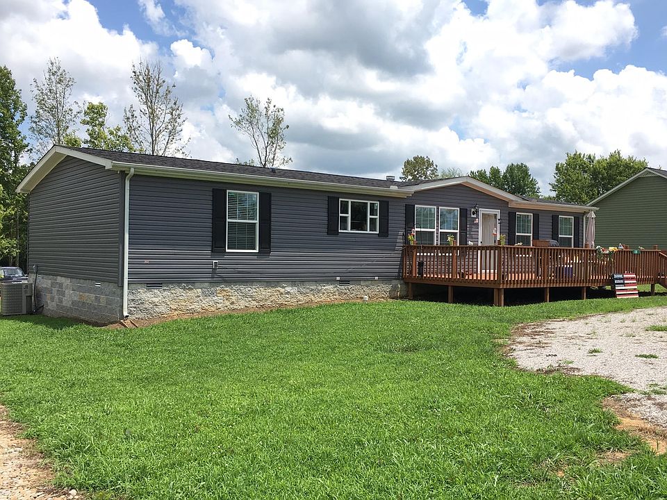 Sharp upscale manufactured home on permanent foundation with finished sheetrock, crown molding, trex deck in front and large yard with large shed, Large deck in back, hot tub, above ground pool brick patio, fire pit, landscaped front. Curved driveway plus additional driveway, gas heating, stove & dryer. Beautiful wood burning fireplace, stainless steel appliances, new marble backsplash in kitchen & master bathroom, wood laminate flooring throughout the home, laundry room, walk-in closets in all 3 bedrooms, pantry in kitchen with tons of cabinets. Island & breakfast bar. Ceiling fans in master bedroom, living room, 1 spare room. Pot rack above island. Landscaped back fenced in yard.