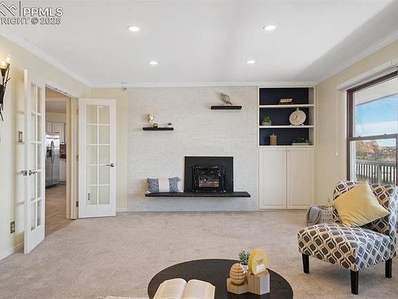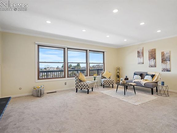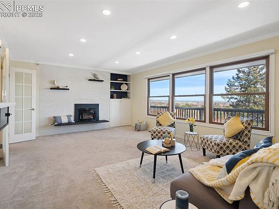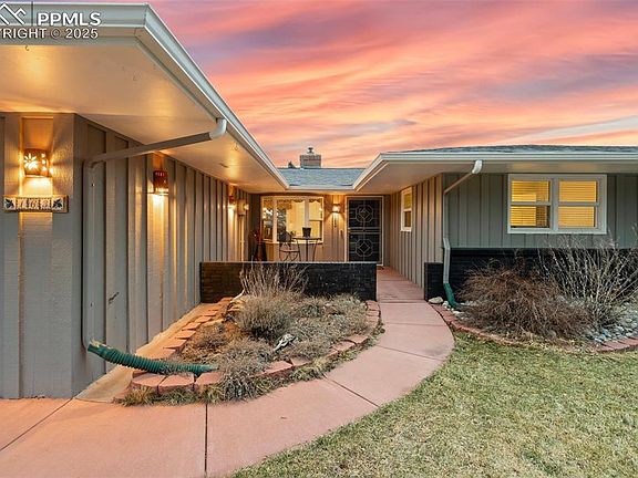 Perched on a wide, quiet street lined with mature trees, this stunning home offers breathtaking views of Garden of the Gods & twinkling city lights from the kitchen, living room, and back deck, while Pikes Peak & the surrounding mountains create a picturesque backdrop from the front yard, kitchen, and front bedrooms. Step inside to find an enormous kitchen w/ beautiful cabinets, granite countertops, a large island, soft-close drawers, a dining area with a walk-out to the expansive deck, and a bonus bay-window nook perfect for a play area, or relaxing with a book. The adjacent sunroom, flooded with natural light, boasts a gas stove & walls of windows, making it ideal for a bright office or workout space, w/ direct access to the terraced side yard—a fully fenced-in outdoor retreat featuring a large concrete patio, a hot tub, a gravel area perfect for dogs, & a gardening space, making it the perfect spot for summer picnics, relaxing in the shade, or gathering with friends. The living room features a gas fireplace, built-in shelving, & elegant clear glass French doors. The primary bedroom is a true retreat w/ 3 spacious closets, built-in reading lights, & an updated en suite bath w/ in-floor heating & a skylight. All 3 main-level bedrooms showcase beautifully refinished hardwood floors, & the hallway includes an additional full bath. The basement is just as impressive, featuring a cozy family room w/ a gas fireplace & a walk-out to a lower deck, a 2-room suite, a huge storage room w/ built-in shelving, a laundry room w/ gas & electric hookups for the dryer, & a ¾ bath with a large walk-in shower. Additional highlights include a newer 200-amp electrical panel, newer vinyl windows, & major system updates in 2016, including a new roof, HEPA-filter furnace, water heater, & A/C. The beautifully landscaped front yard features a charming patio, perfect for morning coffee. This home is the perfect blend of comfort, character, & modern upgrades, all in an unbeatable setting.