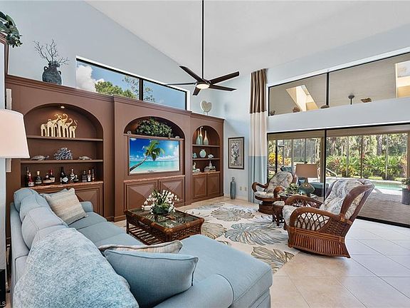 Fantastic 3BR/2BA villa with 2-car garage, only minutes to the Eagle Creek Villa Homes clubhouse. Magnificent Golf course & mature landscaping views combined with Southern exposure, numerous transom windows & large glass sliding doors bring the outdoors in. Expansive brick paver lanai features skylights, privacy wall & screen enclosure with private pool & spa, sun deck & additional seating area, plus an outdoor kitchen with built-in grill, refrigerator & granite countertop. Porcelain tile floors on the diagonal in main living areas. Courtyard entry, Great Room floor plan, vaulted & volume ceilings, recessed lighting, decorative light fixtures & fans. Well-appointed kitchen with pantry, white appliances & cabinets, tile backsplash, built-in desk, breakfast bar & plenty of counter space. Separate dining area overlooks lanai. Spacious master suite has large bay window with plantation shutters, walk-in closet & remodeled en-suite with skylight, composite wood floor, dual sinks, seamless glass walk-in shower & soaking tub. 2 additional bedrooms with remodeled bath for guests' privacy, plus laundry in residence. Electric shutters for peace of mind. This is a Golf Membership property.
