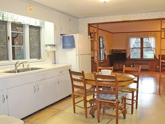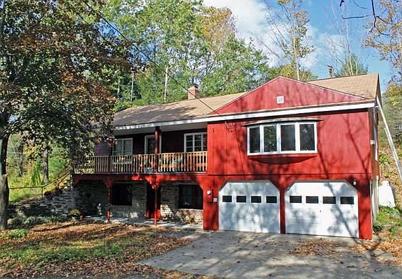Blink and you will drive right by this special property. Set back from the road on 4.7 private acres hiding behind a large wooded ledge you'll find this one of kind home in a very private setting. Step up onto the front porch and enter into the cozy kitchen that is open to the living room with a corner fireplace on one side and French doors that opens into an incredible family room on the other side. So spacious, this magnificent sun filled room greets you with a wall of windows that goes from the floor to the cathedral ceiling with a picturesque view of the barn and the trail that meanders though the woods. It even has a loft room above! The lower level has two small rooms in the front with built in bunks, work shop area, as well as access to the 2 car garage. The grounds offer a nice mixture of woods and a hill that leads to a open flat and tillable space which was a large garden for many years and an added bonus of a solid post & beam barn with large sliding doors and a loft