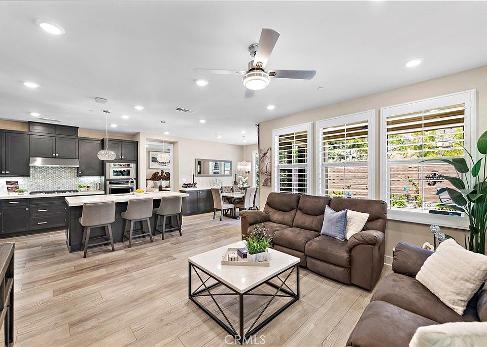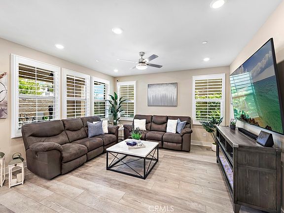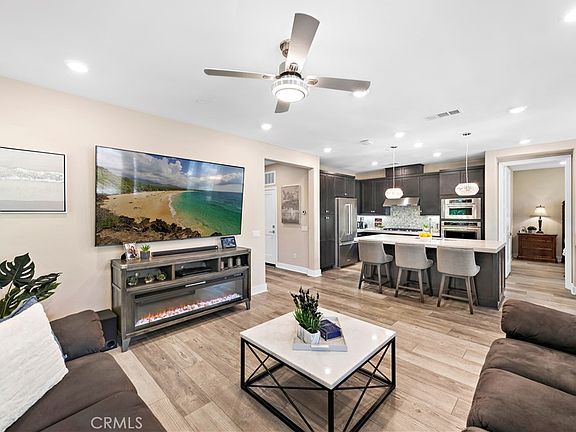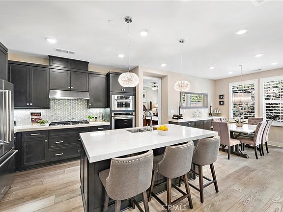 WOW! This beautiful 55+ Home has an optional assumable 2.25% Loan for VA Entitled Veterans! Rancho Mission Viejo's 55+ Living at it's finest! This home was beautifully designed to maximize space and privacy with the primary suite and den/office/3rd Bedroom on the first floor plus the secondary bedroom and bath, a bonus room and covered view deck upstairs. A fantastic floorplan for having guests stay over, or two offices, a craft room or the grandkids space. This beautiful home has over $130,000 worth of upgrades including beautiful luxury vinyl plank floors throughout, 7" baseboards, marbleized white quartz countertops, rich espresso cabinetry, custom glass and stainless steel hexagonal tile backsplash, ceiling fans and recesses lighting throughout, all Stainless steel appliances, and a quartz topped built-in buffet in the dining area. The striking glass pendants gracefully hang over the kitchen island and complement the dining room chandelier. This open concept home provides the perfect gathering space with the great room and the ranch room creating an indoor outdoor experience. The Den can easily serve as a 3rd Bedroom for guests, an office or a game room. Primary suite is positioned at the back of the house with plantation shutters overlooking the lush yard for privacy. Ensuite primary bath with dual sink quartz topped vanity, Kohler raised sinks, zero entry step-in shower with frameless glass enclosure and a walk-in closet with custom built-ins. First Floor laundry room is appointed with upper cabinets and a large walk-in pantry area and is tucked in the hallway with the convenient powder bathroom. Upstairs is the large bonus room that can serve as an additional living room, office or movie-theater room and is next to the guest bedroom and full bathroom. The view deck off bonus room provides stunning hillside views, cool breezes and a great place to watch the sunrise. Back downstairs the sliding door from the dining room opens to the Ranch Room and custom designed backyard with paver patio, built-in gas firepit with glass rocks, stone bbq island with polished concrete counter, tranquil fountain and large turf lawn plus turf lined paver stepping pads on large side yard. This neighborhood is walkable to Hilltop Club steps away and is a vibrant neighborhood with many activities. Access all of the premier 55+ amenities plus all of the All Age pools, gyms, parks, bocce ball, and more. Youthful 55+ Living at it's best!