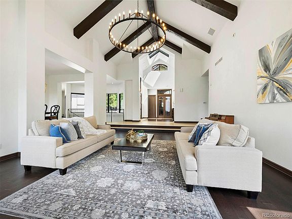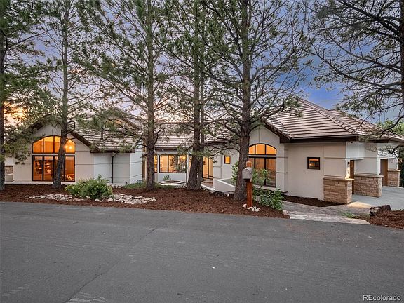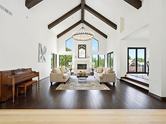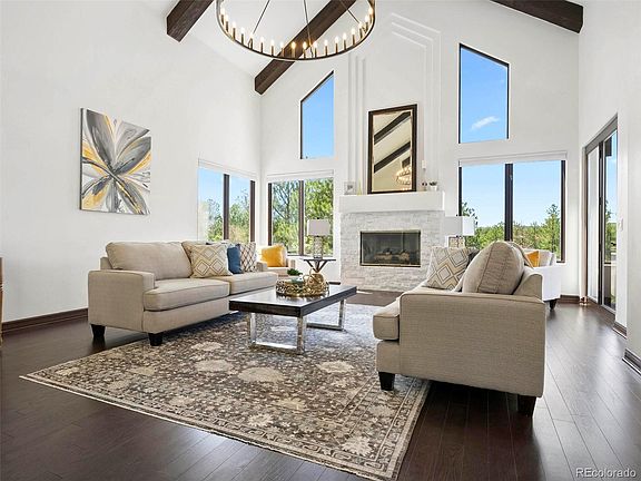 This stunning Castle Pines home was just extensively remodeled to reflect the ul:mate in taste and sophistcaton. The seller made high-quality, long-term improvements in every room, antcipatng this was their “forever home.” Each space was metculously redone, including new interior and exterior paint, new and updated flooring throughout, new electrical and meticulously selected lightng features. In the living room, newly added ceiling beams provide scale and dimension, and high ceilings create a sense of space, anchored by beautul wood floors, immaculately redone in rich dark tones. The main living space takes advantage of stunning views, highlighted by a gorgeous open floorplan. The newly designed kitchen incorporates gorgeous stone countertops, new butler’s pantry, walls of windows and a dramatic stacked stone fireplace surround. The formal dining area affords picturesque views through windows and doors opening to a private deck. The main-floor primary suite was redesigned with richly hued wood flooring and an elegant see-through fireplace ensconced in tasteful stone stacked to the ceiling. In the bath, dramatic windows bathe the new quartz countertops in light, and all new fixtures in each bath add a lustrous flair. Downstairs, the finished walkout basement is an idyllic retreat, with loads of tall windows, additional bedrooms, and a wonderful light-filled workout space