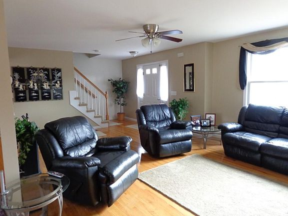 Upstairs: master bedroom, full master bathroom, 2 bedrooms, second full bathroom and carpeted floors. Main floor: hardwood flooring, living room, cozy dining room, 1/2 bathroom with washer and dryer, kitchen with stainless appliances: side-by-side fridge, gas oven/range, and granite counter tops. Dining area leads to wooded deck/patio overlooking a large backyard. Basement: finished basement is divided into four parts. A main carpeted rumpus room, office or optional 4th bedroom, a 1/2 bath, and closed-off unfinished storage area and mechanical space that houses the HVAC and water heater. The garage is large enough to park 2 full size automobiles and deep enough to permit some additional storage. The backyard is large and fully fenced in with a wood fence, approximately 40yds long along back edge. Neighborhood is friendly with childrens' parks nearby, a walking trail, and paved sidewalks.