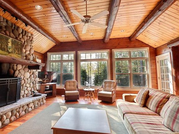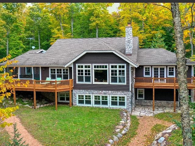 Don't cut your search short at the border! Beautiful, private wooded lakeside estate built to last the ages and is nestled on an exceptional 5+ acres with 350" frontage on Homan Lake. Homan Lake is a pristine, quiet, deep, jewel of a lake with million dollar estates & is located just north of WI/ MI border. Quality customized home built by Benson Builders in 2006. Main floor features cathedral ceilings, wood beams, saw cut Fir flooring & hand hewn trim, large living room, massive stone fireplace, Chef's kitchen open to dining area that flows to large lakeside screened porch, master suite with private lake balcony, guest bedroom/den, large foyers & laundry room. An abundance of warmth and natural light stream thru lakeside span of windows. Lower level walkout has 9ft. ceilings, large family room, massive stone fireplace and wet bar, lovely and private bedroom, 'bunk' room sleeps 8, exercise room, full bath and lakeside sauna with shower. Insulated and heated garage. See Doc Tab. 2084M