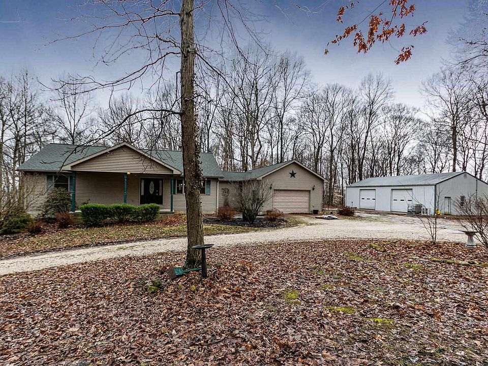 Perfect setting for those who want to escape and enjoy the privacy of 21.59 wooded acres. Stunning views and no close neighbors. 4 BR, 3-1/2 BA large ranch style home with two master suites, living room with fireplace, spacious eat in kitchen with plenty of cabinets and counter tops, formal dining room, half bath, mud room and laundry on the main level. Featuring hardwood and tile flooring in the main level living spaces. Kitchenette, family room with gas log fireplace, full bath and two additional bedrooms are located in the finished walk out basement. 2 car attached garage plus a 48x32 detached garage/workshop. So many possibilities as a primary residence or an exceptional property for vacations or simply to get away. Call today for your personal tour.