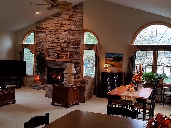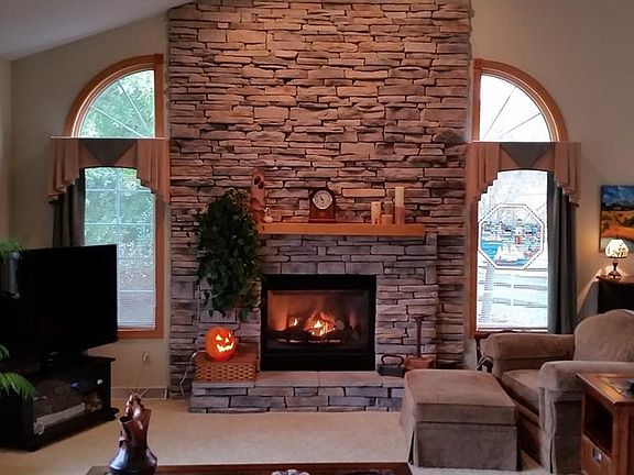 Stunning CUSTOM Cape Cod with open floor plan & a beautiful stone fireplace! First floor master suite and first floor laundry. Anderson windows and doors. OPEN GREAT ROOM includes VAULTED spacious areas for entertaining, dining, and wherever your imagination goes... STACKED STONE floor to ceiling gas FIREPLACE sets the stage. WOOD FLOORS at foyer lead to kitchen. That Beautiful kitchen has CHERRY cabinetry topped with the latest concrete-looking CORIAN with integrated sinks. Porcelain tile backsplash and breakfast bar complete this fully applianced kitchen. First floor laundry has built in cabinets with washer/dryer, and sink on Porcelain floors. Large and Lovely first floor master bedroom has double windows facing treed yard. Master bath has garden tub and walk in shower, double sinks with GRANITE.. all on PORCELAIN tile floors. Walk in closet is 11 x 8. Half bath next to laundry room. Upstairs is a loft living space open to the great room. Two spacious bedrooms and full bath complete the upstairs. Whole house vacuum system. Deck out of French doors leads to COZY vaulted screened-in room. The basement is unfinished, 12 course and ready for finishing. Extra big 2 car garage. Quality shed, walking path, perennials and trees make for a lovely private home tucked in with a great view of the rolling hills. Don't miss out on this fine home. Close to Rawiga golf and outdoor swim Club & REC Center, Indoor swimming, fitness center and gathering room. Bike trail too!