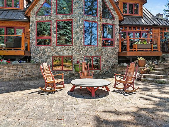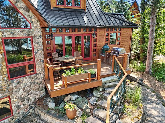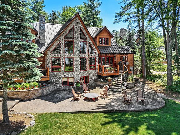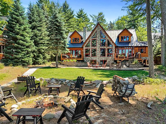 Discover unparalleled beauty and luxury of Higgins Lakefront living at this stunning home, nestled perfectly on the east shore of Kennedy Beach. This 6-bedroom, 5-bathroom sanctuary offers incredible views of Higgins Lake and breathtaking sunsets, boasting 107 feet of pristine pure sand frontage for the ultimate waterfront enjoyment. The home features a spacious living room with a vaulted ceiling, expansive glass walls overlooking the lake, and a majestic stone fireplace. The open floor plan with huge Douglas fir beams and flooring from reclaimed heart pine create a lodge-like atmosphere. Enjoy a main level primary suite with a private deck, another en suite on the upper level, and a gorgeous chef's kitchen equipped with black walnut countertops, hand-carved edging, a Wolf range, and a gas fireplace. A metal roof and cedar siding ensure durability and enhance the exterior's aesthetic appeal. The fully finished walkout lower level is perfect for entertainment; it includes a large family/recreation room, a sixth bedroom with an adjoining office area, workout space, and a fifth bathroom. Other features include a 3-car attached garage, private spa deck, a second garage, carport, generator for backup power, and central air conditioning for comfort. Accessed via a private road, the lot is approximately 700 feet deep and well wooded with mature pine trees. Don't miss the opportunity to own this exceptional lakeside retreat.