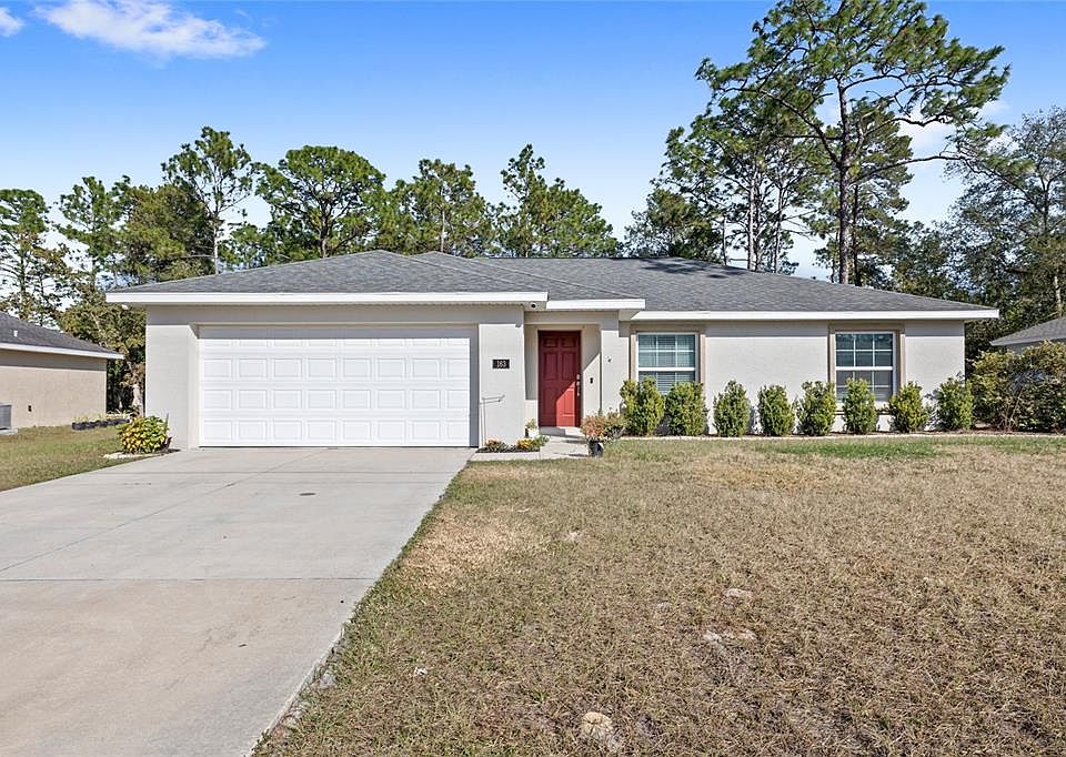 Under contract-accepting backup offers. Welcome to 163 Marion Oaks Pass, a beautiful single story home nestled in the highly desirable Marion Oaks neighborhood in Southwest Ocala. Completed in 2020, this 3-bedroom, 2-bathroom home offers an open-concept, split floor plan. From the moment you arrive, the home’s charming curb appeal draws you in. The spacious living areas feature tile floors, granite countertops, and solid wood white cabinetry. The kitchen is equipped with stainless steel appliances and a built-in countertop cup rinser for added convenience. The primary suite is complete with a large walk-in closet and a private bath with a beautifully tiled shower. Both guest bedrooms are thoughtfully designed with upgraded closet systems, providing ample storage space. This home also boasts Google Nest security cameras, an Amazon smart thermostat, and an included washer and dryer. The two-car garage provides plenty of room for vehicles and storage. With an inside laundry room and a functional layout, everything about this home is designed for comfort. Beyond the home itself, the location is incredibly convenient. Just a few miles west of I-75, you have access to everything. The neighborhood features large sidewalks, and nearby amenities. For families, the backyard playground is negotiable. Don’t miss the opportunity to make 163 Marion Oaks Pass your new home!
