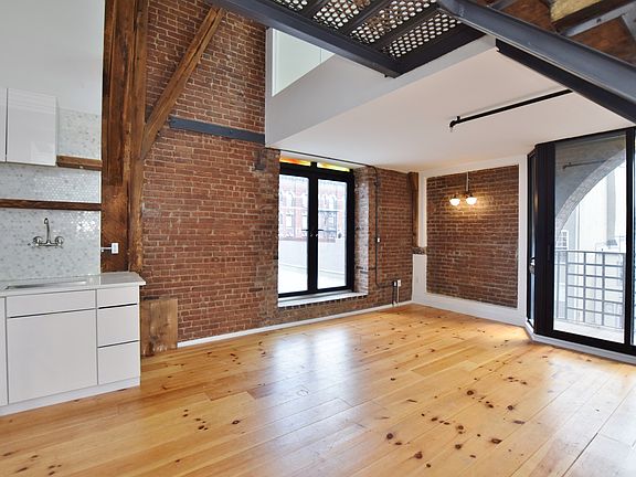 Sun-drenched one bed two bath duplex loft with large private terrace in the heart of Williamsburg. Experience the definition of rustic elegance at 163 North 6th st, where contemporary brilliance meets ancient European charm. Live within the walls of one of North Williamsburgs oldest landmarks, the former St. Vincent De Paul Church that has been masterfully restored and converted into authentic loft apartments - with its extraordinary beauty intact. Here, modern details and state-of-the-art finishes blend flawlessly with expertly salvaged materials, including original exposed brick, reclaimed Heart Pine pillars and beams, arched stained glass windows, custom steel work and exceptional quirks around every corner. Sprawling layouts, some with soaring 20 foot ceiling heights, and matchless distinction create incredibly rare and unique living spaces not found in NYC today. Enter through the towering building entry and make your way down dramatic hallways, adorned with dark leather walls and inlaid wood floors made from 100-year-old shipping boxes. Inside each loft duplex you will find reclaimed wooden staircases leading to the mezzanine, with sliding wooden doors, catwalks made of distressed cast iron and stunning en suite bathrooms. The custom designed open kitchens contain Caesarstone countertops, impeccable penny tiled marble backslashes, Kingston Brass fixtures and boast a gourmet appliance package of top-of-the-line appliances with Bosch washer/dryers, Fisher-Paykel dish drawers and stainless steel Bloomberg appliances. Each residence, unique in its own right, contains bathrooms with reclaimed brick walls, pressed tin ceilings, steam showers and custom built vanities with imported stone. Over-sized, arched windows create bright, sun-drenched rooms throughout, and wide plank hardwood floors lend a loft-like feel to each spectacular room. 163 North 6th is located around the corner from the L train at Bedford Avenue, only one stop outside Manhattan as well as countless bars, cafes and boutiques in one of NYCs most desirable areas. Transport yourself back to the prohibition era in time for cocktail hour with oysters, infused gin and debonair bartenders at Hotel Delmano. Snag some one-of-a-kind vintage attire at Antoinette, catch a movie at Williamsburg Cinema or head over to 35-acre McCarren Park, which has dog runs, a public swimming pool, fields for soccer and baseball and a Green Market on weekends.