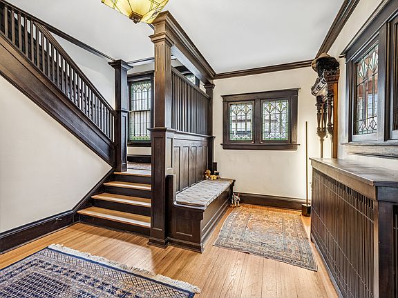 This amazing Prairie-influenced home and its coach house are nestled in the heart of beautiful Oak Park. You'll love the rich wood details, stunning art-glass windows, and modern updates that make this space truly special. As you step inside, the grand entry foyer welcomes you and leads into a large formal living room with a stately gas fireplace. Picture hosting your favorite holidays in the formal dining room, which features original built-ins. For anyone who enjoys cooking, the custom cook's kitchen is a dream, featuring a triple Miele station and is ready for your best culinary creations. Don't forget to check out the back mudroom and the front screened porch! On the second level, the primary suite is a serene getaway you won't want to leave, along with two other cozy bedrooms, a main hall full bath, and convenient laundry room. The third level is versatile-it can be a guest suite, a fourth bedroom, or a home office, complete with its own full bath. The lower level has a spacious rec area, currently set up as a fantastic workout space with a sauna. With a generous 50x171 lot, the backyard is simply beautiful. The back coach house adds even more charm, featuring a living room/dining room combo, a full kitchen, one bedroom, and a full bath. Don't wait-this incredible home in this prime location won't last long!