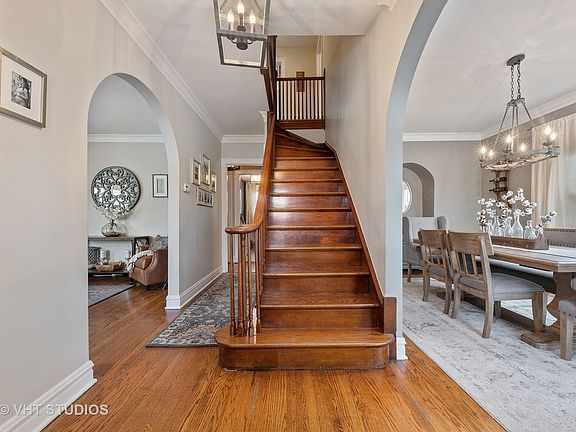 Located directly across from an Olmsted park, the perfect blend of old world charm and modern amenities is present throughout this gorgeous and fully updated brick and stucco English Tudor Revival. The welcoming foyer opens to a lovely oak turned staircase and leads to the elegant living room with wood burning fireplace. The inviting formal dining room enters to the kitchen with white shaker cabinets, stainless steel appliances, granite counter tops and eat-in center island. The adjacent den/office overlooks the yard complete with patio, perfect for outdoor entertaining. A bedroom and updated 1/2 bath complete the 1st floor. The 2nd floor hosts a spacious master bedroom with dressing area, vaulted ceilings, and ample closet space, plus an additional 3rd bedroom. The remodeled bathroom is spa inspired with skylights and a soaking tub. The recently finished and dry lower level with vinyl plank flooring offers versatile space, currently being used as a family room and play area. Other features include hardwood floors, coved molding ceilings, solid wood panel doors, central AC, laundry room, 2 car garage and more. This special home is beautifully appointed and turn key ready!*Currently no homeowner's exemption & PROPERTY TAX APPEAL IS PENDING *VIRTUAL/FACETIME TOURS AVAILABLE