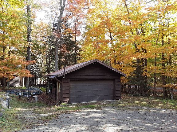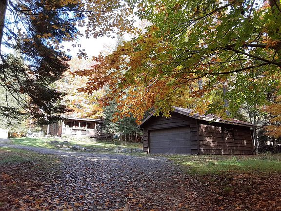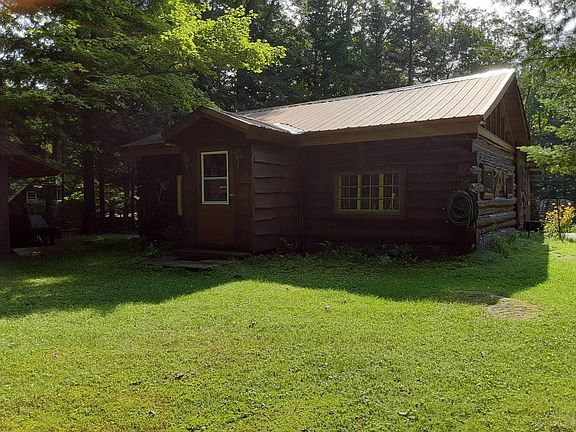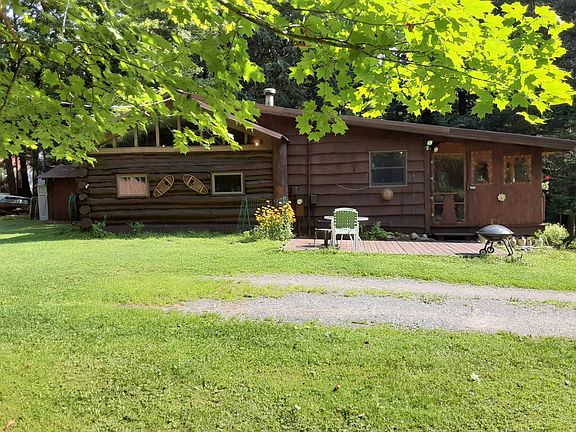 Perfect setting for year round use. This 3 bedroom, 1 bath home has all the charm of an Adirondack log home with a newer addition that has a modern kitchen and bath. The kitchen has double glass doors that open onto the 10x16 covered front porch. The side patio is a great place to grill and enjoy the sunny days. This property has plenty of storage for all kinds of toys or tools. There is a 8x10 enclosed shed with an open 4x8 roofed area out back, as well as an additional 8x16 shed and a 20x24 insulated and heated drive thru garage on the property. There is also a fenced in garden area out back for your flowers or vegetables. Agent owned.