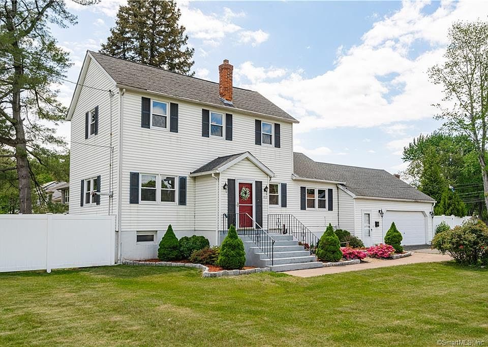 Move - in ready! This charming Colonial Home in a lovely neighborhood, has lots of curb appeal and has been updated (new windows, repointed chimney with warranty, and vinyl fence), painted and immaculate both inside and out. This home has a beautiful kitchen, complete with plenty of cabinets and working space. Kitchen has stainless steel appliances- including a new stove/oven with gorgeous granite counters. The dining room has wainscoting, vaulted ceiling and wall sconces and opens into the kitchen allowing for large family dinning. The living room with gleaming hardwood floors, has a large screen tv with sound system, wood pellet stove and mood lighting underneath the crown molding. The main floor has a half bath as well as a bedroom/office with vaulted ceilings and wall sconces. The second floor has two bedrooms, one is a large master bedroom with two double closets, as well as a full bathroom. New carpet has been installed on the staircase and upstairs hallway. Pull-down attic and full basement with plentiful storage. You will love the oversized two-car attached garage and replacement windows. Rear mudroom area leads to the totally awesome backyard, completely enclosed with white vinyl privacy fence, patio for outdoor living space and a fire pit. This home is near the center of Newington, and close to the Cedar Mountain Trails. Steps away from a great playground and close to School. This very special Home is one that you must see!