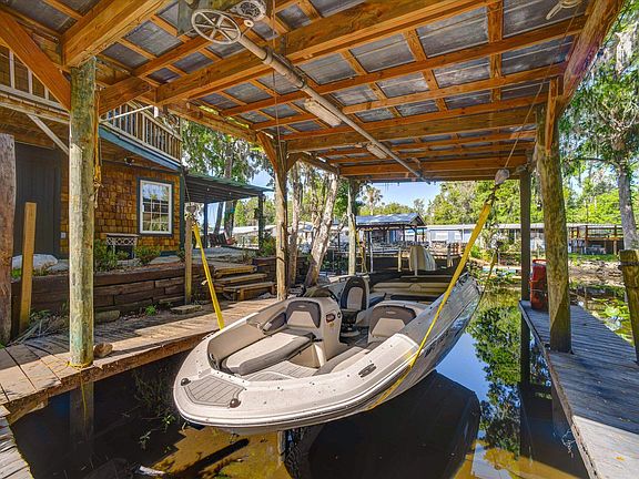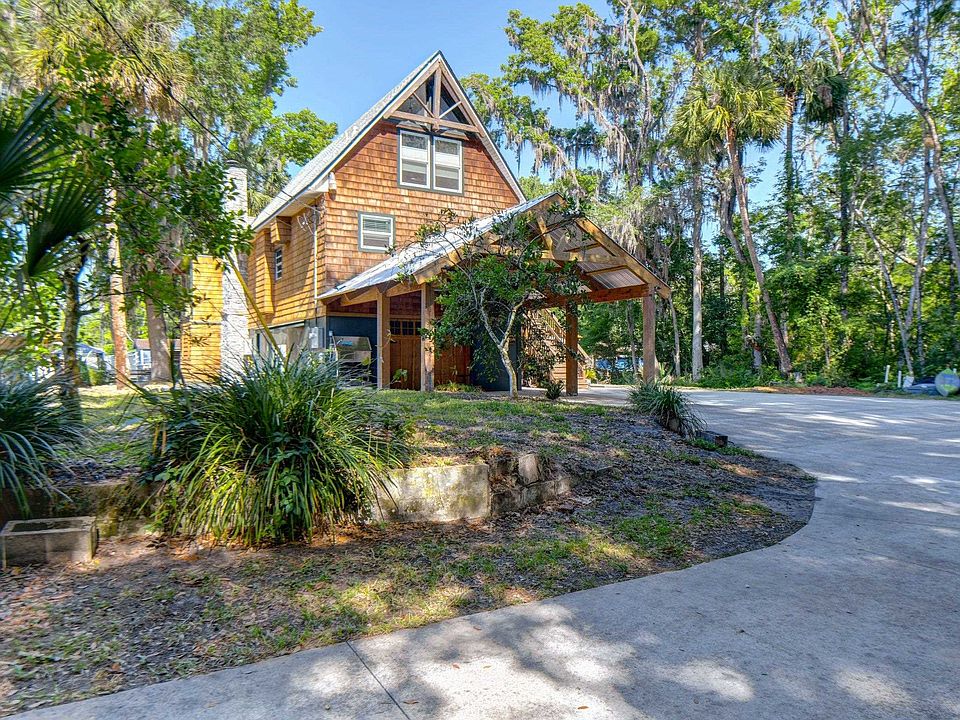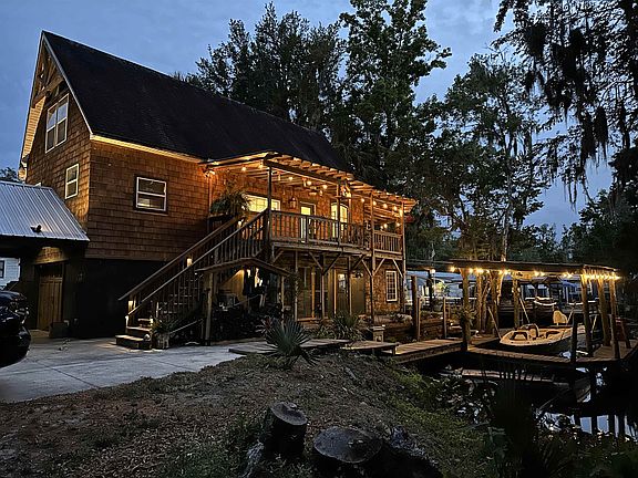 ENJOY THE RIVER LIFE ON THIS 4.31 ACRE CANAL FRONT HOME. SITUATED ON A PAVED ROAD, THE WATERFRONT LOCATION WELCOMES YOU TO THIS OLD FLORIDA CEDAR SHAKE CHARACTER HOME NESTLED AMONG ACRES OF NATURAL FLORIDA WILDERNESS. THE LOWER LEVEL FEATURES A 26' x 20' GARAGE, A POST AND BEAM STYLE CARPORT AND A SEPARATE 800 SF APARTMENT WITH BATH, KITCHEN AND LIVING SLEEPING AREA. THE SECOND LEVEL FEATURES A CHEF'S KITCHEN WITH UPSCALE APPLIANCES, A COZY DEN AND FIREPLACE, A BEDROOM AND BATH. THE LOFT HAS ANOTHER BEDROOM AND BEAUTIFULLY TILED BATHROOOM. THE HOME ALSO HAS MULTIPLE DECKS AND PATIOS FOR ENTERTAINING AND RELAXING. LEAVE YOUR BOAT IN THE COVERD DOCK WITH LIFT SO YOU CAN ACCESS THE RIVER IN JUST MINUTES. THIS HOUSE IS A MUST SEE! THIS HOME HAS BEEN REMODELED INSIDE AND OUT WITH QUALITY WORKMANSHIP AND CUSTOM DESIGN. FEATURING NATURAL GAS RANGE,HOT WATER HEATER, DRYER AND COOKTOP, MINI SPLIT HVAC'S, A WOOD BURNING FIREPLACE, OUTDOOR KITCHEN WITH HUGE WRAP AROUND DECKS FOR WATCHING THE SUNSETS,CUSTOM BUILT ISLAND WITH SEATING, LVP AND HARD MAPLE FLOORING WITH CUSTOM TILE THROUGHOUT. THE COUNTER TOPS ARE MARBLE AND GRANITE. A GREAT OPPORTUNITY TO OWN A PIECE OF NAVIGABLE WATERFRONT PARADISE. Items Not included in the Sale but Negotiable are: Gas Dryers, Washer, Refrigerator and Freezer in the Garage area. Other negotiable items are The Green Egg, DCS natural gas grill and the TEC natural gas grill.