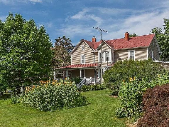 Storybook Farmhouse on 2.2 Acres, which includes 3-bedroom, 3-bath, plus additional bonus rooms - this versatile property offers strong potential for rental or supplemental income. Enjoy the beautiful pastoral views and a welcoming wraparound porch. Inside the main house, you'll find hardwood floors throughout, a parlor with wet bar and built-in bunk, a spacious primary bedroom with balcony porch and clawfoot tub, and a large laundry area. The kitchen offers 2 individual sinks, Corian countertops and an impressive 32ft of counterspace with warm Hickory cabinets. Comfort is ensured with a 2-zone heat pump. Outdoor living is effortless with a veranda featuring an outdoor fireplace and hot tub. The detached 2-car garage includes a heated workshop. You'll find a separate cottage that offers a bedroom, bathroom, kitchenette, and attached greenhouse with its own cistern. The Greenhouse provides supplemental passive solar warmth in addition to the cottage's main heating system. The cottage also features a screened in porch and two-tier deck. Relax, unwind, and take in all this home offers—serene surroundings, gorgeous views, quiet corners, and plenty of space to spread out, breathe, and make every day feel like a storybook.