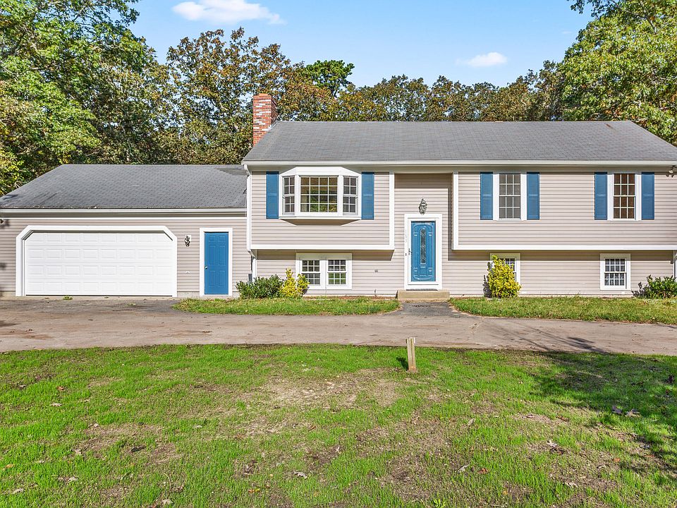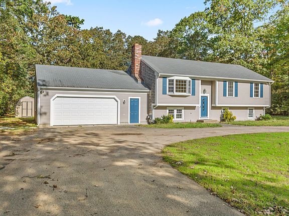 This move in ready raised ranch with a horseshoe driveway sits well off the road on a large level lot. This is a terrific location, situated close to the Mid-Cape Highway, restaurants, and shopping. Fireplaces in both the living room and in the lower level family room create a wonderful ambiance when entertaining or just relaxing. You'll love gleaming oak floors in the living room that continue down the hall and through all three bedrooms of the main level. The kitchen features granite tops, a tile back splash, stainless appliances, and a dining area. A sliding door takes you from the dining area to a huge composite deck overlooking the private back yard. On the lower level you will find a beautiful family room with a fireplace and wainscoting, a large bedroom that also has wainscoting, a bath/laundry room, and a utility room. The over-sized two car garage would also make a great shop for your hobbyist. There are two sheds as well as storage above the garage and in the attic so storage space will not be an issue.