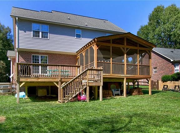 Welcome home! This inviting brick home boasts vaulted ceilings in the living room and a gas log fireplace with a brick surround. Owner's suite features a beautiful tray ceiling and garden tub. Refrigerator, washer/dryer, and bunkbeds in bedroom #3 convey with the property. Enjoy the crisp, fall evenings from your screened-in porch and grilling deck, or wander the neighborhood trails that lead directly to Bellingham Park. Fenced in backyard is great for entertaining. Located in the sought-after Mooresville Graded School District and convenient to downtown Mooresville, this home is perfect for a variety of lifestyles. Per the seller, water heater was replaced in 2017 and HVAC was replaced in June 2019. Downstairs HVAC is a Gas/Electric Package Unit and upstairs is a Heat Pump.