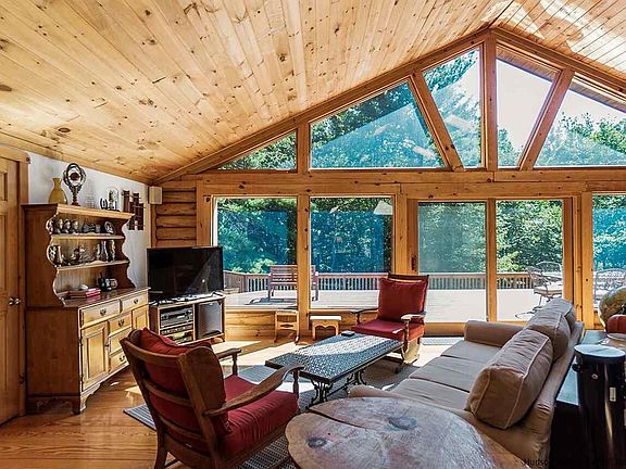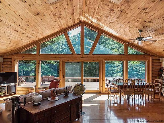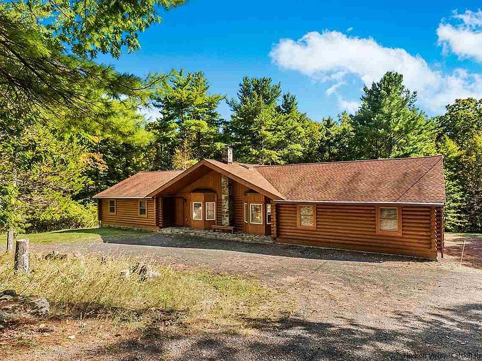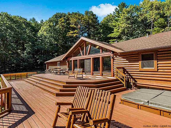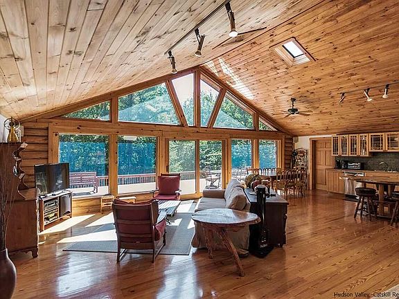 The ultimate mountain hideaway just 2 hours from NYC. Imagine sitting on your private deck in your hot tub taking in views over the surrounding woodlands. This life of leisure is on offer in this beautiful custom log home located just two hours from NYC. You will live midway between the NYS Thruway and Windham Ski Mountain on a private 6.97 acre lot with seasonal stream and seasonal mountain views. Inside, the home has been designed to make the most of the views. The superb great room is an expansive 33'x23' with soaring ceilings and a vast wall of windows. From here, you can step out to the two-tier deck with a large, sunken hot tub and views over the surrounding land.The great room also has a wood stove and is open to the updated kitchen. There are three bedrooms, two bathrooms with all-natural stones and a Jacuzzi tub. Gleaming pine flooring flows throughout and there is a large utility room with a built-in dog wash. A 2 car garage completes this impressive home. Recent updates include a new central air conditioning, new hot water heater, new chlorination filter on the well, newly encapsulated crawl space and an approximate 5-6 year old roof.