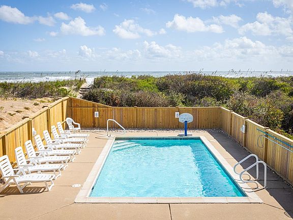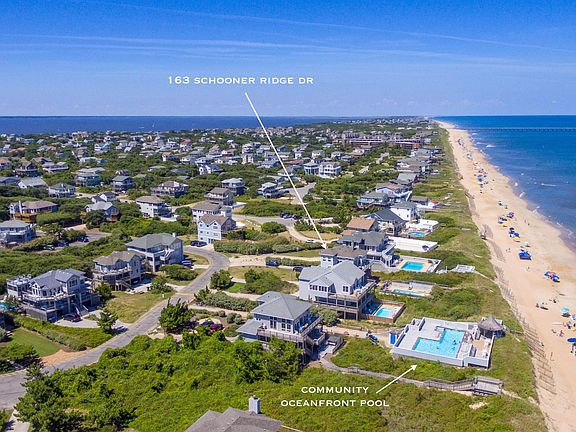 MAJOR UPDATES FINISHED IN SEPT 2023! Don't miss this rare opportunity in one of the BEST neighborhoods in Duck! Just upgraded with NEW ROOF, ALL NEW AND EXPANDED DECKING, ENLARGED FENCED IN POOL DECK, NEW BEACH WALK WAY, NEW WINDOWS, FLOORING, SOME NEW SIDING, LIGHTING, FURNITURE,NEW SEPTIC 2024,INTERIOR PAINT, AND FRONT ENTRY. PROJECTED INCOME WITH UPDATES $298K/YEAR. Situated on a huge oceanfront lot with almost 75 feet of oceanfront, enjoy panoramic views of the Atlantic from this well-appointed 7 bedroom home in the Schooner Ridge neighborhood of Duck. The reverse floorplan and open living space on the top level allow you to soak in the views from the spacious top level decks, living room, kitchen, dining room and loft. The mid-level boasts 4 bedrooms, three of which are masters with a private en suite bath. The ground level has three additional bedrooms and a gameroom with pool table and direct access out to the newly expanded outdoor area with a private fenced in pool and hot tub and your very own walkway to the beach. This comfortable coastal retreat is situated in the heart of Duck Village in the coveted neighborhood of Schooner Ridge with great community amenities such as clubhouse with an indoor pool, fitness center, game room, tennis courts, racquetball court, playground, and oceanfront community pool. You're only a short bike ride or walk to the shops and restaurants in Duck! NEW top level HVAC in 2022.
