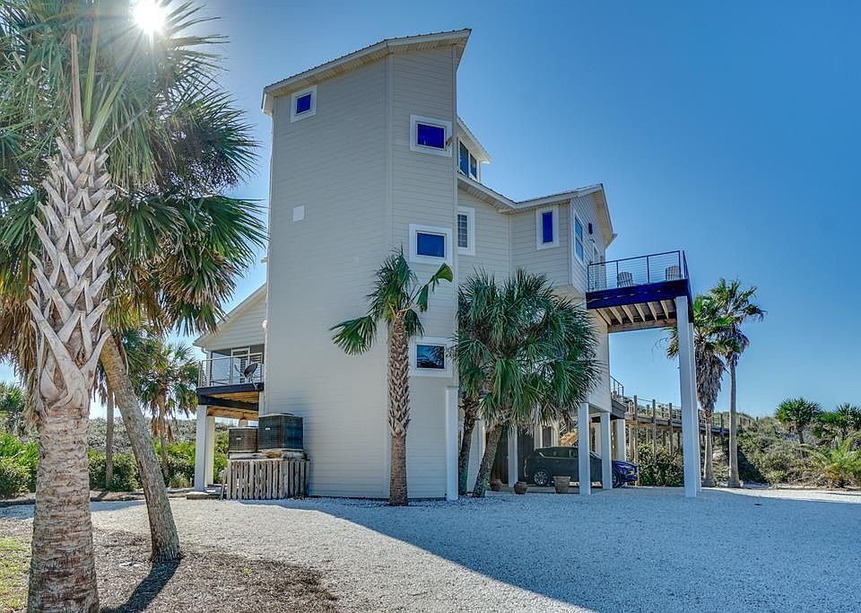 Bella Vista is a distinctive 4BR/4BA gulf front home that sits on 2.75 acres and is located on the north end of Cape San Blas. Nestled between the blue/green waters of the Gulf and magnificent dunes, this home has a contemporary, open floor plan, that allows each floor captivating gulf views and unparalleled privacy. The property extends from the road to the gulf with a private driveway that is enhanced with 55 palm trees. Remodeled in 2020, the many features of this home includes porcelain tile floors, modern furnishings, floor to ceiling Pella windows, high end appliances that includes a Thermador refrigerator, 75" TV, automatic storm shutters, and elevator. There is room for a pool and other structures. A unique and rare find!!! There is an RV site on property w/50amp service and sewer cleanout hookup beside home.
