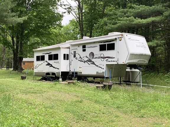 Wonderful opportunity to own 57 all level acres with over 2,000 feet on the maintained road, part woods, seasonal stream. drilled well and walking trails and gardens...plus best of all a 5th wheel trailer that sleeps 6. Camp now summer, spring, fall or winter and enjoy the beautiful NW Catskills and build your dream home in the near or far future. Fantastic, comfortable home base and get-away from the city.....less than 3 hours from the GB Bridge and 30 minutes to ski in Hunter and Windham.