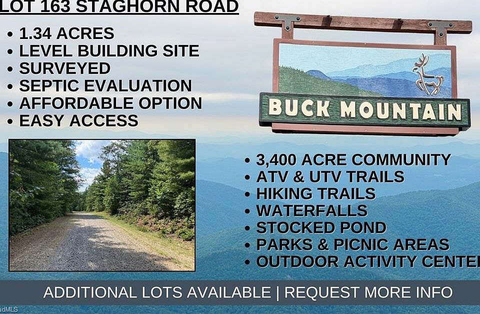 This 1.34 acre lot offers a unique opportunity to build on either side of Staghorn Rd. Survey-Aug. 2024. Preliminary soil report completed by Piedmont Environmental-Sept. 2024. Underground electric nearby. FIBER OPTIC available. Driveway in place. This tranquil setting is near the cul-de-sac on Staghorn Rd. Build your weekend getaway or vacation rental property on this great building lot in the 3,400 acre Buck Mountain community...ONLY GATED ATV COMMUNITY in Wilkes County. Long & short-term rentals allowed. PRIME LOCATION! Arrive at the gate from Winston in 1 hr & from Charlotte in 1 hr 40 min. Centrally located 35 min from Boone, West Jefferson & Wilkesboro. Close to High Country Activities, BLUE RIDGE PKWY, ASU, shopping, dining, golf, wineries, breweries, mtn biking & skiing. BUCK MTN AMENITIES: ATV & Hiking Trails, Parks, Fishing Pond, Water Falls, Pavilions, Community Ctr, Helipad, Outdoor Activity Ctr. 1,400 SF min. NO TINY HOMES. NO MOBILE HOMES. NO CAMPING. NO SELLER FINANCING.
