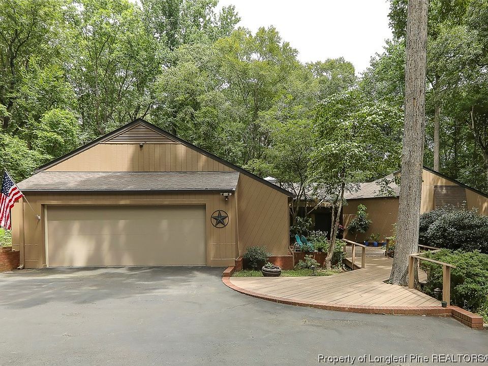 Stunning custom-built contemporary home with magnificent views nestled in nearly a 2-acre lot. Located in the gated and golf community of Carolina Trace. This home offers plenty of space at 4202 sq ft. Beautiful chestnut wood walls, ceilings, and cabinets throughout the home. Huge eat-in kitchen that shows no shortage of counter, cabinets, or pantry space. Formal dining area, large living room, and jaw-dropping office/den. Large owners suite with updated bathroom and large walk-in closet. 2 nice sized bedrooms on the main floor. Finished walk-out basement with wood-burning fireplace and full bathroom has plenty of space for a pool table, theater area, or gym. Completely modern networks, ready for any and all network designs. Includes router, switch, and complete high definition camera system. 2 Additional parking spots and extended driveway.