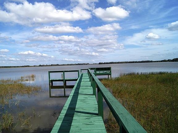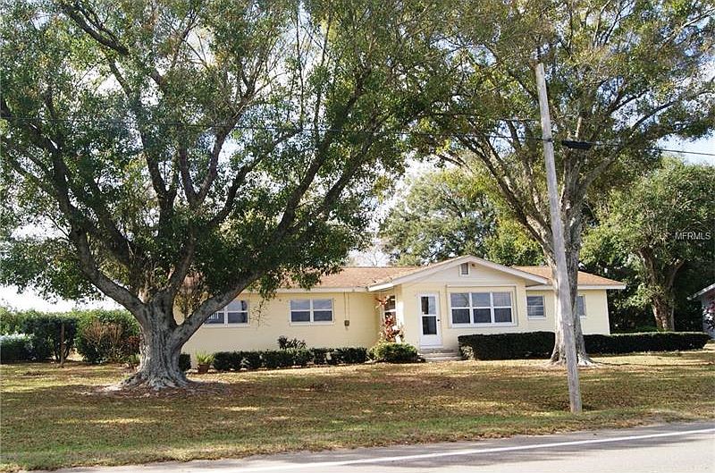 SPECIAL LOCATION just outside of city limits, across road from Moody Lake and a corner lot! This concrete block home has a large master bedroom and a guest bedroom. (Master bedroom was once 2 bedrooms). Home has been updated with thermal windows, an electrical upgrade, armed security system, 1 year old Carrier central heat and air system, a "just installed" deep well (end of 2016), nicely painted, and move in condition. The step-saver kitchen has nice and adequate cabinetry. There is a view of the lake from the spacious living room, dining area, master bedroom, as well as the enclosed front porch. The dining room has built-in cabinetry for China & dishes. The hall bath has a tub only, and the other bath/utility room has a shower only. The home has ample storage, and there is a storage room in the garage as well. The corner lot is adorned with huge oak trees and has mature landscaping. Just what every guy wants, several outbuildings! Behind the home is a block building. In addition there is a metal barn/workshop that is 14x20 with electricity and another 20x14 building without electricity. There are two lean-to's and a large chicken coop! Across the road there is a nice dock on Moody Lake. Surrounded by orange groves and the lake this home is an ideal location and a must see.