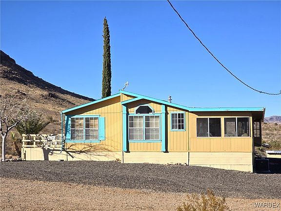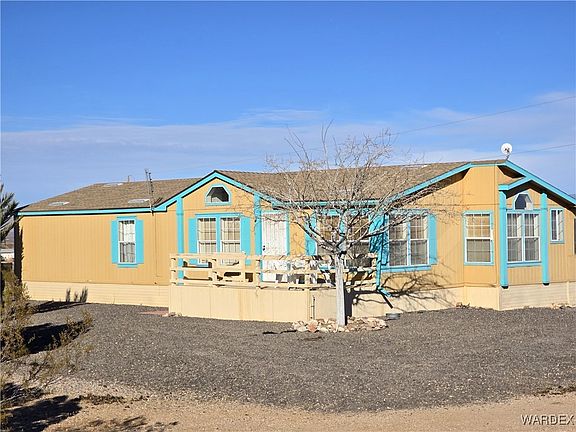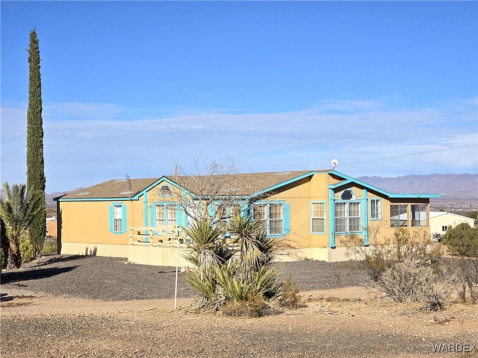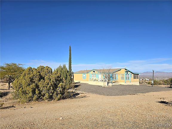 STUNNING LOCATION WITH MILLION DOLLAR VIEWS AND VALLEY FLOOR LIGHTS AT NIGHT!! Imagine stepping out your front door and directly across the street is BLM land and the Mount Nutt Wilderness area which encompasses over 28,000 acres. This 2BR, 2BA 1,620 sq. ft. MH is nestled in the Southwest foothills of Golden Valley at the base of the majestic Black Mountains where you can enjoy hiking, rock climbing, biking, horseback riding, off roading, wildlife watching, etc. Enjoy panoramic mountain and valley floor views and the Cerbat and Hualapai mountain ranges from this much sought after location. This wonderful home is located on a usable 2.28-acre lot, dotted with juniper bushes, natural desert landscaping and local wildlife. Watch the sunrise color the mountains from the front porch while having your morning coffee and enjoy watching the sunset and colors change over the valley from the 10X60 screened in Arizona room a perfect place to bring the entertaining outdoors, sit, relax, take in the views and dine alfresco. A spacious interior awaits you with plenty of windows and skylights to let in the natural light and those amazing views. Vaulted ceilings, generous size living room, formal dining area, plus eat in light and bright country kitchen with an island, built in desk area and plenty of cabinet and counter space. the laundry room has a sink, cabinets and folding station. The primary bedroom features a dble door full-length walk-in closet and ceiling fan, the primary bathroom has a built-in dressing table. Walk down the hall and you will find the nice size guest bedroom and a full guest bathroom. Also, there's a cozy den off the living room that has a closet so a conversion to a bedroom could be possible. Some of the improvements over the years include new flooring in the kitchen and baths, new appliances, new toilets, hot water heater and roof. Some furnishings will be included with the sale. There's plenty of space to build a garage/shop on the property. Come and enjoy exploring our beautiful Arizona desert, sunrises, sunsets and starry night skies. Don't wait call a Realtor and schedule your personal showing of this fantastic property today!