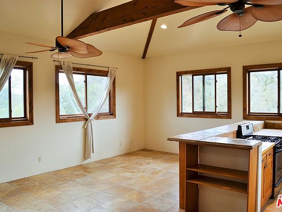 Very private guest house on an approx. 11 acre ranch. Canyon and mountain views. Beautifully finished with travertine and satillo tile floors. Charming covered patio connects the main structure to a large art studio/yoga room with its own kitchen/bath/and sleeping loft, perfect for guests. Main guest house is 2 stories with a romantic master suite, with viewing deck. Large livingroom, full bath, and laundry. Hiking trails, oak trees, complete privacy, gated, perfect writers retreat.