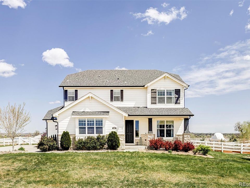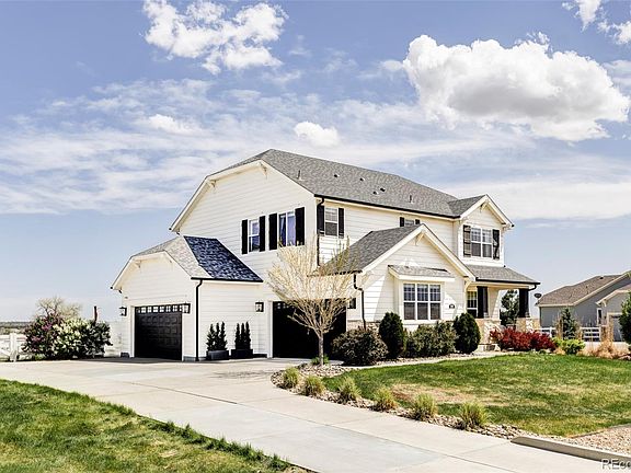 This exceptional home sits on over an acre of beautifully landscaped land, offering breathtaking panoramic views and ample space for outdoor enjoyment. Inside, the home flaunts a spacious floorplan with designer touches throughout. The large kitchen opens to the living and dining areas, featuring a cozy fireplace, sweeping views, and vaulted ceilings that enhance the sense of space. The large primary suite provides a private escape while the second-floor flex space is perfect for a playroom, office, or hobby area. With a 4-car side-entry garage and an unfinished basement pre-plumbed for a bathroom, this home offers tremendous potential for expansion. The property backs to permanent open space, with a fenced yard that includes a divided field, goat barn, and chicken coop. Established flower garden beds, mature plants, and drip irrigation are thoughtfully integrated into the property. Situated on a premium lot featuring the best views in the neighborhood, this prime location allows for the enjoyment of sunrises in the east, sunsets in the west, and truly extraordinary panoramic firework displays every July. With easy access to modern conveniences, this home offers a perfect blend of neighborhood living and country tranquility.