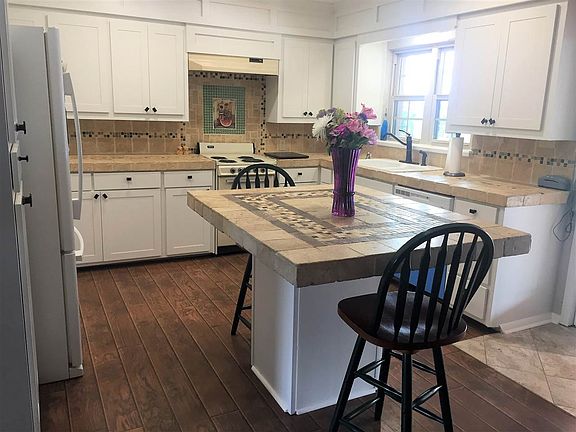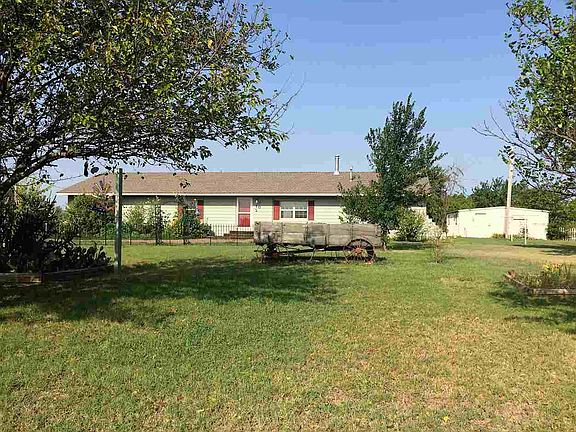 Quiet Country living!!! This large home is located on approximately 2.50 acres with an additional 40 acres available that have corrals and a pond. The property features a 2250 SF home, a lovely in-ground pool with a unique water feature and stream as well as an in-ground storm cellar, a large metal shed with open stall on one end and a 28’ x 50’ workshop. The home has 4 very large bedrooms, 1.5 baths, a separate laundry room and large open Living-Dining-Kitchen area. The kitchen has been updated with modern shaker-style cabinetry, recessed lighting and dark bronze hardware. There is a floor to ceiling pantry space as well as a large island with breakfast bar seating and under counter storage. The dining is spacious and perfect for a large country kitchen table with sideboard. The dining room window looks out over the covered patio and inground pool. The dining room flooring is wood laminate and it is open to the kitchen and living area. The large living area features new carpet, , a dark bronze ceiling fan and a wood burning stove. There are three large bedrooms on the south side of the living space (all with new carpet and fresh paint). Each bedroom features a double closet and the master bedroom has private access into a ½ bath and the full bath. The ½ bath features beautiful granite counter tops, recessed lighting and ceramic tile floors. The full bath features an antique sideboard as the cabinet with an art deco tile counter top and decorative bronze sink basin. There is plenty of storage in the bathroom with floor to ceiling linen space. The 4th bedroom is on the north end of the home and could either be an over-sized bedroom, 2nd living area, play area, media room or home office with it’s own outside access. This home is energy efficient with 2 HVAC systems (1 is electric and 1 is propane), a new propane water heater, insulated vinyl windows, and double wall insulation. The structure is cinder block with insulation inside the cinder block openings. Then there is a layer of insulation over the cinder block and metal siding over that. Mature trees grace this property in several areas providing shade and protection from the harsh Oklahoma winds. There are two large exterior metal buildings. One has an over-sized roll up door and some minor plumbing. The in-ground pool is a 22,000-gallon pool that ranges from 3 ft to 9 ft. It has a beautiful river-rock stream and waterfall that circulates the water with a unique water feature at the main end and lined with beautiful blooms plants making this backyard and the large covered patio an oasis for the homeowner. There are 4 water hydrants throughout the property operated from the well for irrigation, but the home is on rural water. The septic was pumped in 2016. This property is one of a kind and a must-see! Call Kim today to view this home, 580-704-9916.
