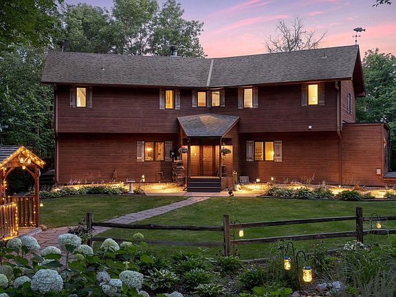 One of a kind home nestled on a serene 16-acre lot! This property offers ultimate privacy and a natural setting perfect for wildlife enthusiasts or hunters seeking their dream location. The updated kitchen is a highlight of the home, featuring stunning finishes including 200 year old wood beams, top of the line appliances, custom cabinets and granite counter tops. Other updates include a new furnace, central air, whole-house water filtration system, water softener and a brand new roof. Upper level includes the master bedroom with a private en-suite and its own balcony to view the beauty of the outdoors. The second bedroom in the upper level has plenty of space and its own private en-suite. Main floor features a two story stone fireplace with floor to ceiling windows that offer an abundance of natural light. The walkout lower level consists of a family room with custom woodwork, wet bar, and a large storage area. The outdoor space is thoughtfully designed, with gardens, walkways, and an irrigation system to keep everything vibrant. A 32x36 pole building and a garden shed offer plenty of storage. Additional highlights include refaced fireplaces, a clover field, food plot, and a generator for peace of mind. Whether you're drawn to the beauty of the land or the modern comforts within the home, this property truly has it all.